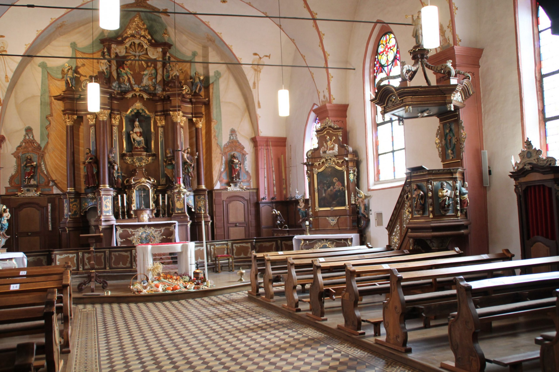 Ebenfalls sehr sehenswert ist der Steinaltar im Nordschiff mit den Helferheiligen, sowie das Retabel aus rotem Sandstein, welches in spätgotischer Tradition im 16.Jahrhundert entstanden ist. Es hängt links neben dem Eingang an der Südwand und zeigt die Heiligen Hubertus, Antonius, Kornelius, Quirinus, Barbara und Ottilie.