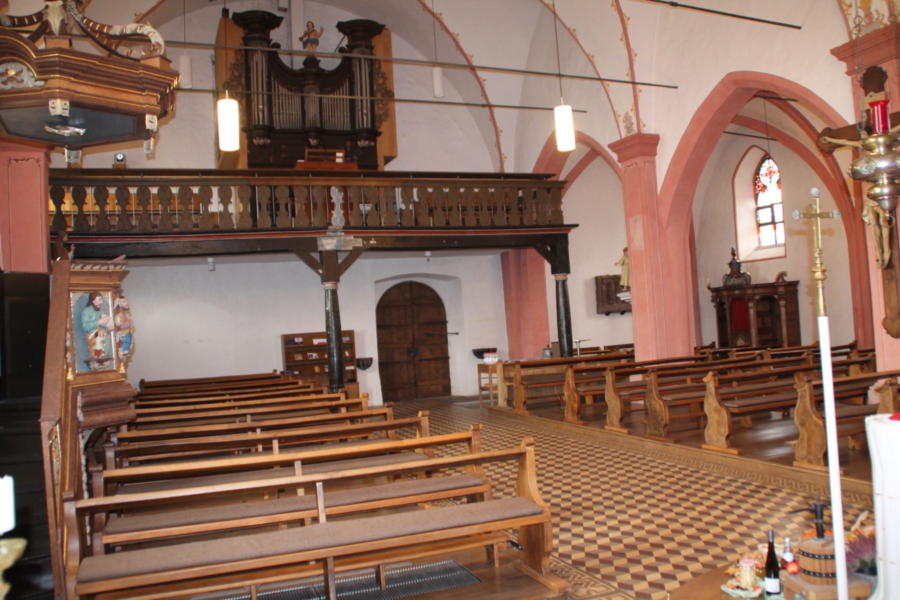 Ebenfalls sehr sehenswert ist der Steinaltar im Nordschiff mit den Helferheiligen, sowie das Retabel aus rotem Sandstein, welches in spätgotischer Tradition im 16.Jahrhundert entstanden ist. Es hängt links neben dem Eingang an der Südwand und zeigt die Heiligen Hubertus, Antonius, Kornelius, Quirinus, Barbara und Ottilie.